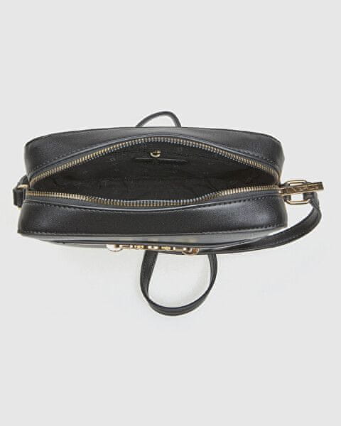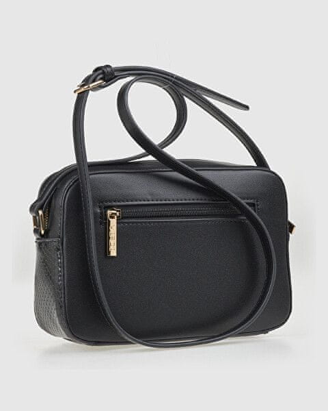 Črna torbica kompaktne kvadratne oblike. Spredaj je okrašen s trakom s kovinskimi obročki in logotipom. Celoten opis