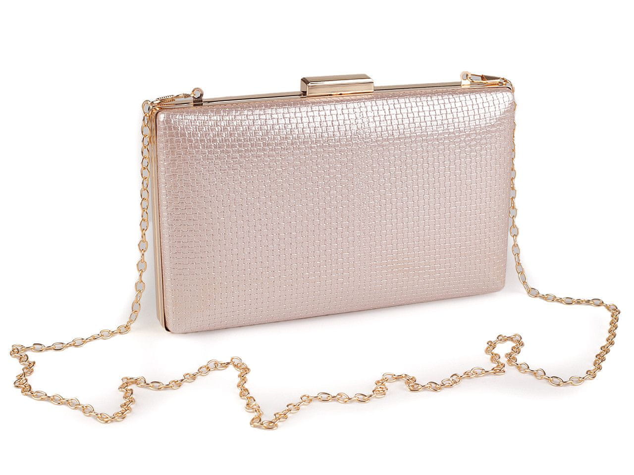 Majhna večerna torbica izžareva eleganco in razkošje, ima kovinski sijaj. Površina ima zanimivo kockasto strukturo. Okrašena je z izrazito svetlečo zaponko in okvirjem po obodu. Torbica je trdno ojačana in vključuje dolgo snemljivo verižico s karabinčki. Nosite jo lahko v roki ali kot križno torbico čez ramo ali navzkrižno.
