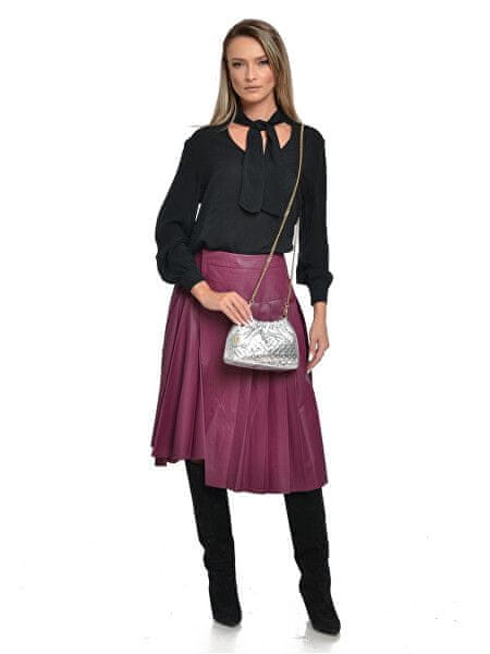 Usnjena torbica v srebrni barvi z izrazitim sijajnim zaključkom. Prešiti motiv ustvarja eleganten in sodoben videz. Celoten opis