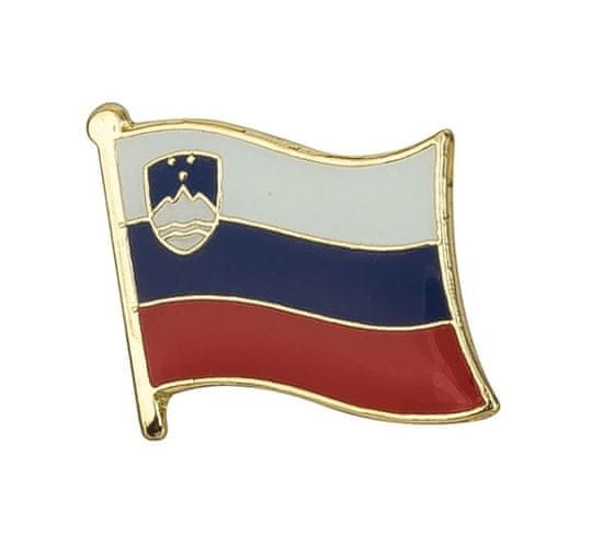 Zastava Slovenije – značka dimenzije približno 1,9 cm 1,6 cm, značka se s pokrovčkom zapne na zadnji strani, tako da pokrije špico.