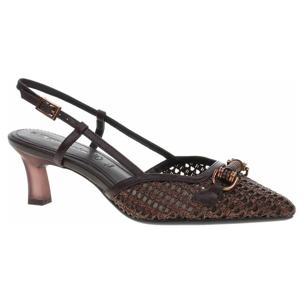 Iščete čevlje, ki bodo vaši obleki dodali eleganco, ne da bi bili videti „kot katera koli druga“? Ali pa morda sanjate o modelu, ki je videti lahkoten in poleten, a hkrati eleganten in graciozno zoži nogo? Ti rjavi Tamaris čevlji so odgovor na oboje. Kombinacija pravega usnja in tkane tkanine ustvarja edinstveno, dimenzionalno teksturo – privlačno, a hkrati subtilno in šik. Tanek, koničast prst doda silhueti kanček lahkotnosti, odprta peta in pašček z zaponko pa vneseta poletno sproščenost, ki je kot nalašč za pomladno/poletno sezono. Dekorativni kovinski detajl na sprednji strani pritegne pogled, lepo dopolni celoto in doda značaj tudi preprosti obleki.
