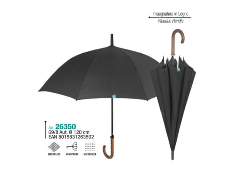 • material: 100 % poliester – tkanina je tesno tkana, poseben premaz iz vodoodbojne smole pa zagotavlja, da se dežnik izredno hitro posuši