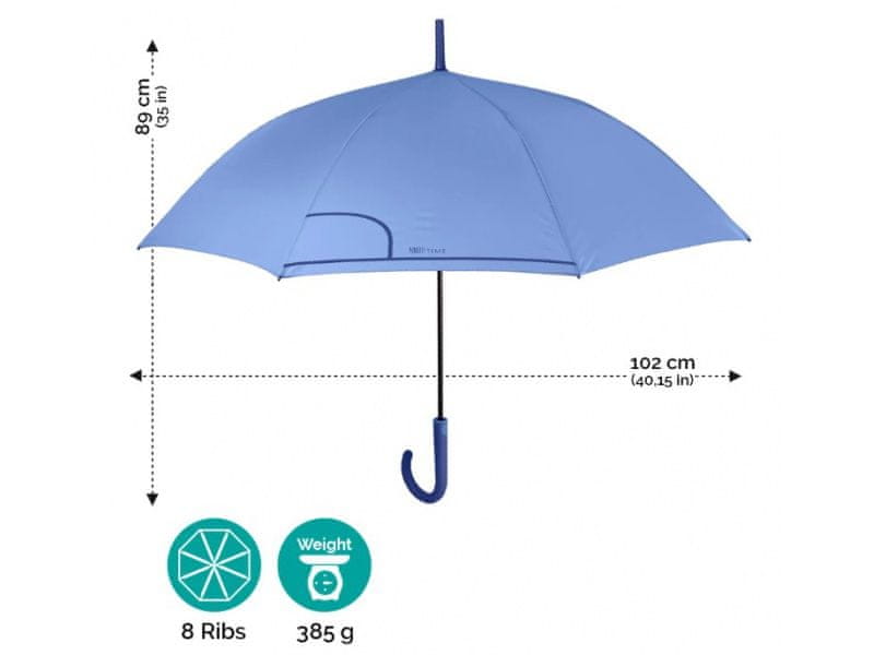 • material: 100 % poliester – tkanina je tesno tkana, poseben premaz iz vodoodbojne smole pa zagotavlja, da se dežnik izredno hitro posuši
