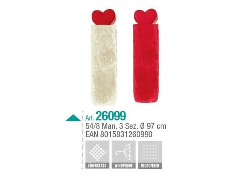• rdeč dežnik z ročajem v obliki srca, primeren kot darilo za valentinovo, prevleka je iz belega ali rdečega pliša