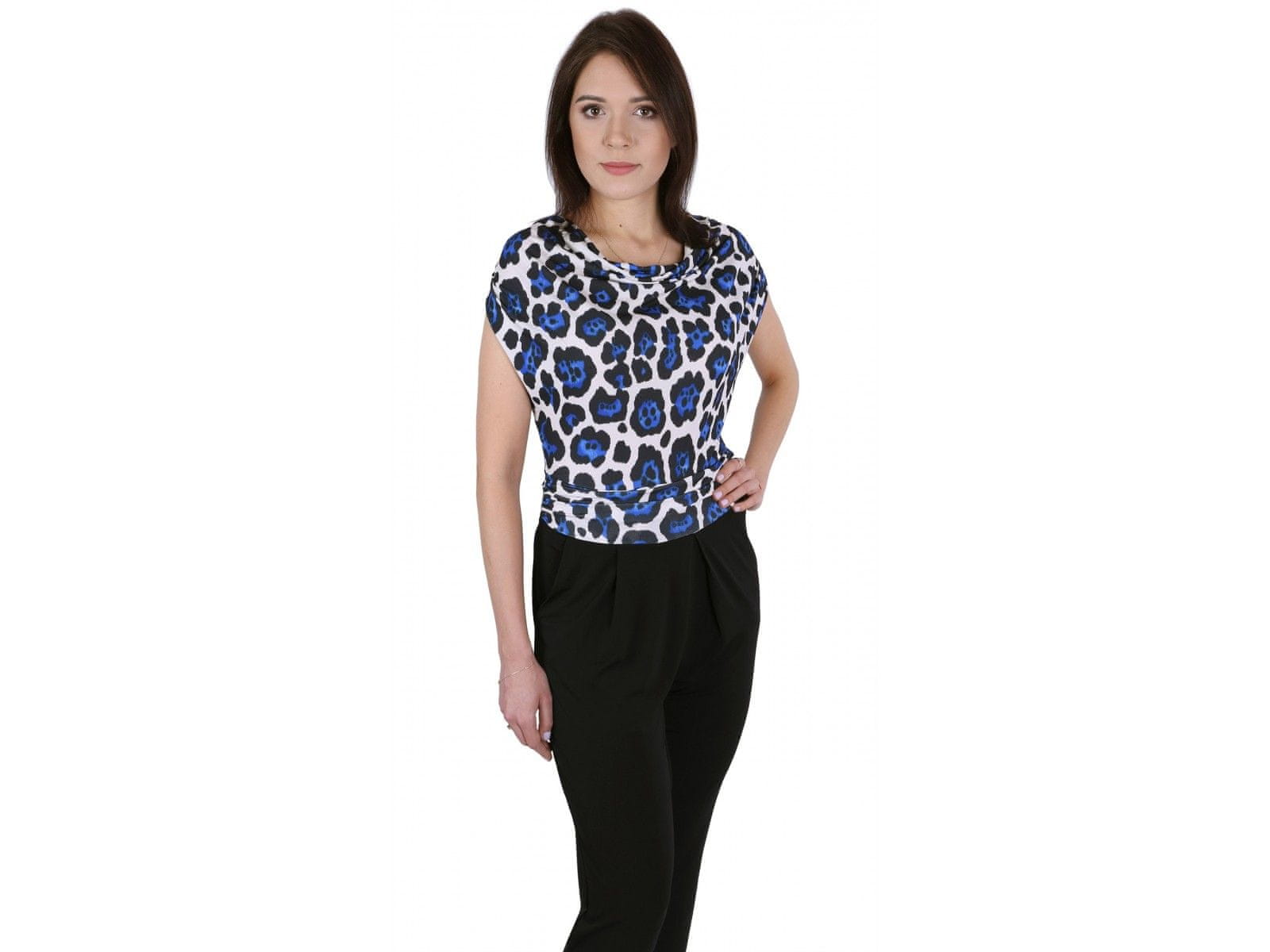 Kombinezon tipa spodnium v modro panterko.Ima preprost kroj.Ob straneh so žepi, zadaj pa dva pasova za zavezovanje.Kombinezon je izdelan iz kakovostnega materiala.Velikosti oblačil so standardne. Skupna dolžina: 146 cm. Celoten opis