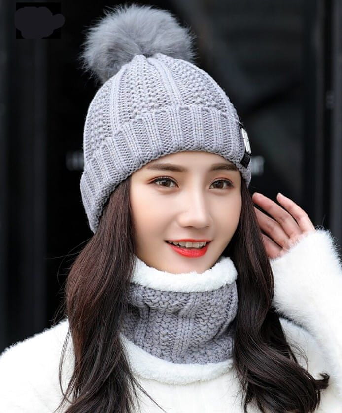 Camerazar Ženski zimski set - izoliran ovratnik in črtast kapica s pompom, siva, 100 % akrilna vlakna