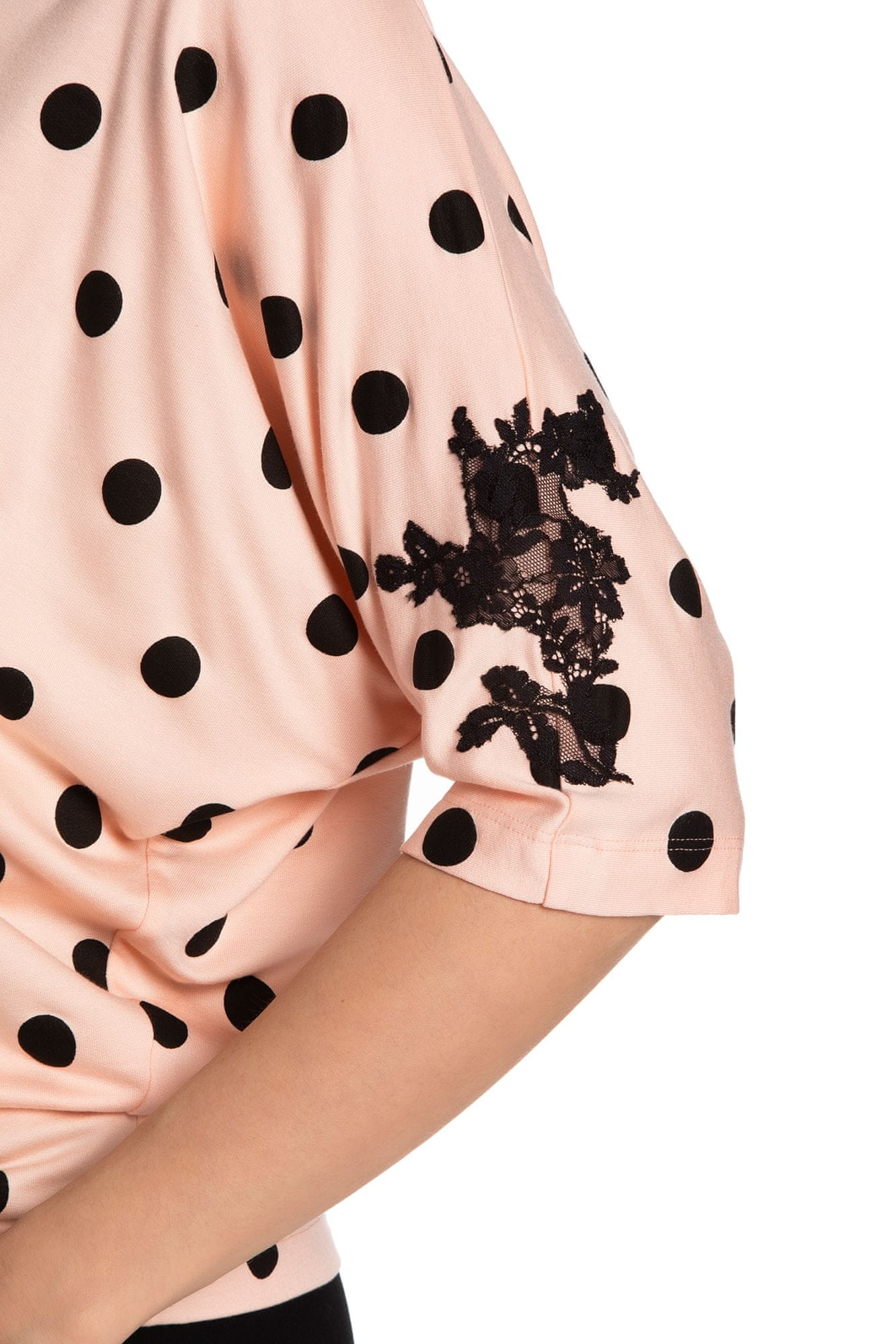 Pleten ženski komplet v rožnatem odtenku s kratkimi rokavi, z v-izrezom in črnimi hlačami. Čipkast poudarek na majici je ročno izrezan iz luksuzne francoske čipke. Idealen za prijeten večer doma, pa tudi za aktivno preživljanje prostega časa. Jersey je pletenina s posebno visokoporozno, pentljasto, zračno strukturo. Ima visoko zračno in paroprepustnost, veliko prožnost in mehkobo. Praktična in elastična tkanina, odporna na obrabo. Ta izdelek je posamično pakiran! Eko vrečka za večkratno uporabo. Zaradi tega so izdelki Effetto odlična izbira kot darilo ljubljeni osebi in dodajo še posebej prijetna čustva ob nakupu.