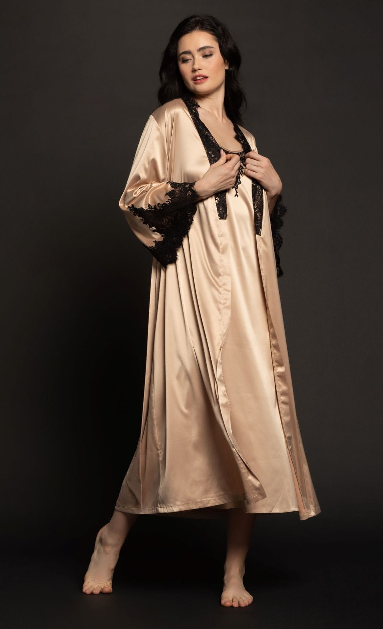 Luksuzna ženska halja iz bež svilenega satena s pasom. Halja je okrašena s črno elitno francosko čipko Chantilly, ki je ročno izrezana. Modna in elegantna večerna obleka. Satinova svila – tkanina ima lastnosti naravne svile, zlahka teče po telesu, izgleda elegantno, sam material pa ostaja dovolj elastičen in gost. Ta izdelek je posamično pakiran! Čipkasta torbica. Takšna embalaža je okolju prijazna, saj ima neomejeno število uporab, oblačila pa skrbno pospravi v omari.