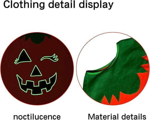 Prevzemite podobo veselega simbola noči čarovnic s tem popolnim kompletom kostuma, ki vključuje ogrinjalo, obroč in torbo. Glavni element je elegantno oranžno ogrinjalo, izdelano iz lahkega in mehkega poliestra, ki je okrašeno s kontrastnim zelenim ovratnikom v obliki listov. Edinstvena značilnost tega izdelka je osvetljen vzorec nasmejane buče, ki po izpostavljenosti svetlobi samodejno sveti v temi s pomočjo fluorescence. Zahvaljujoč ohlapnemu kroju je kostum izjemno univerzalen, saj omogoča nošenje toplejših oblačil spodaj, kar je primerno za hladne oktobrske večere.