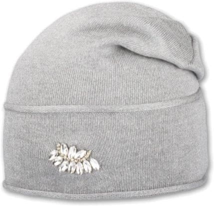 Ženski sivi klobuk. Gladka pletenina v podolgovatem kroju s spuščenim učinkom. Celoten opis