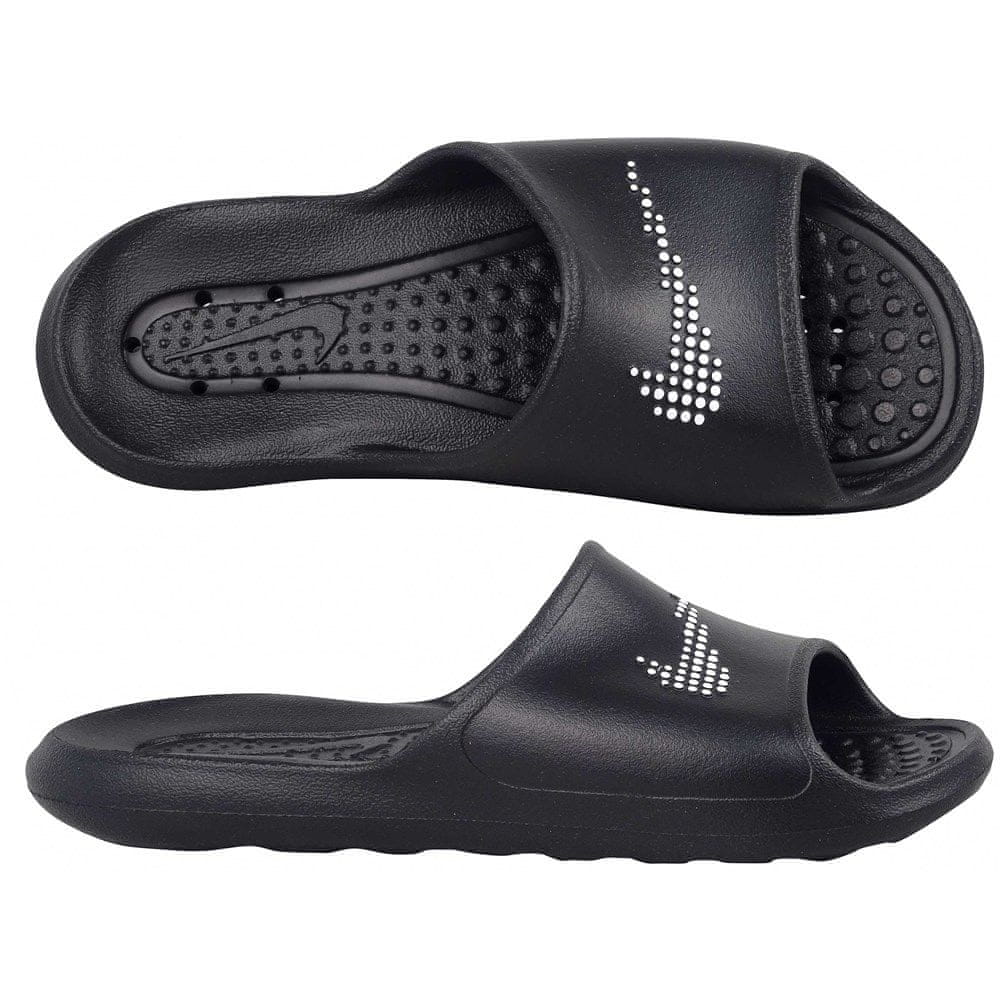 Nike Victori One Shower Slide W CZ7836–001 japonkeZnačilnosti:Ženske japonke Nike so odlična izbira za tople dni ali bazenoblikovan notranji del s posebnimi izboklinamiširok paščekmehak penast vmesni podplat zagotavlja blaženjeoprijemljiv podplatMaterial:sintetikaBarva:črna Celoten opis