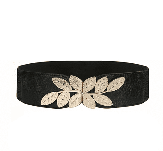Camerazar Elastičen Ženski Pas s Okrasno Sponko Listi, Črn z Zlato Vzorom, Širina 6,5 cm
