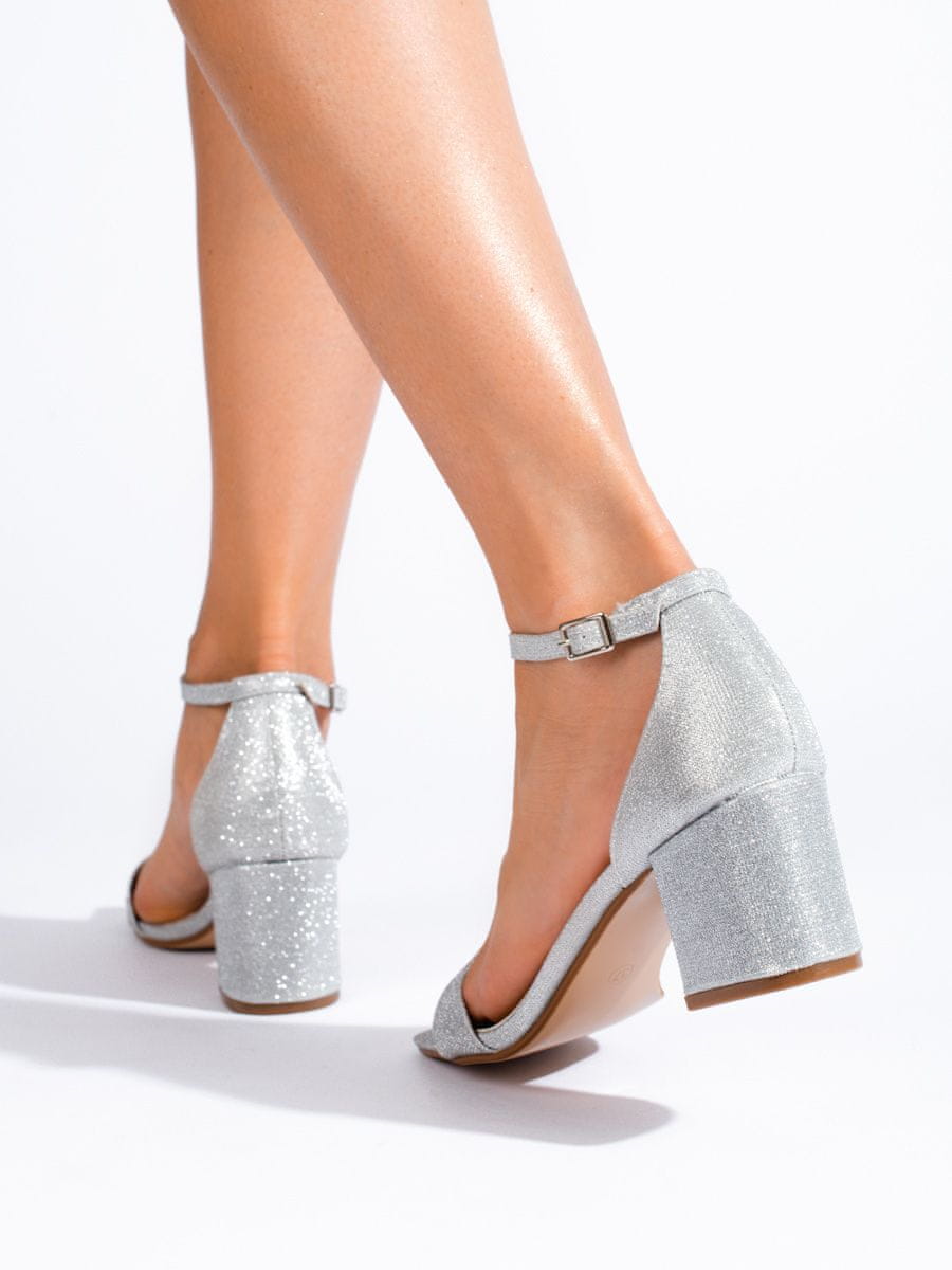 Barva Srebrny, Višina pete 5cm – 8cm, Peta 6,5cm, Vrsta pete črtast, Vložek ekološko usnje, Stil eleganten, Stanje novo, Vrsta konice odprta, Noga odprto, Material tekstylny, Podplat umetna masa, Sezona Wiosna, Priložnost za večer / žur, Vrsta zapiranja zaponka, Vrsta ženski. Celoten opis