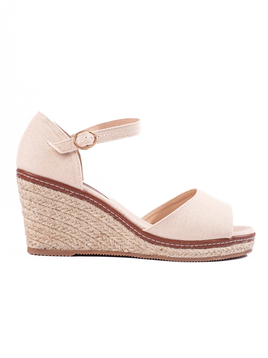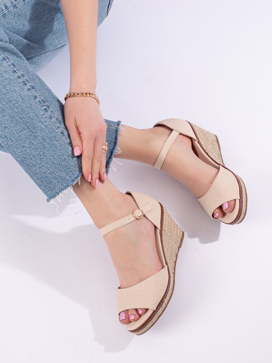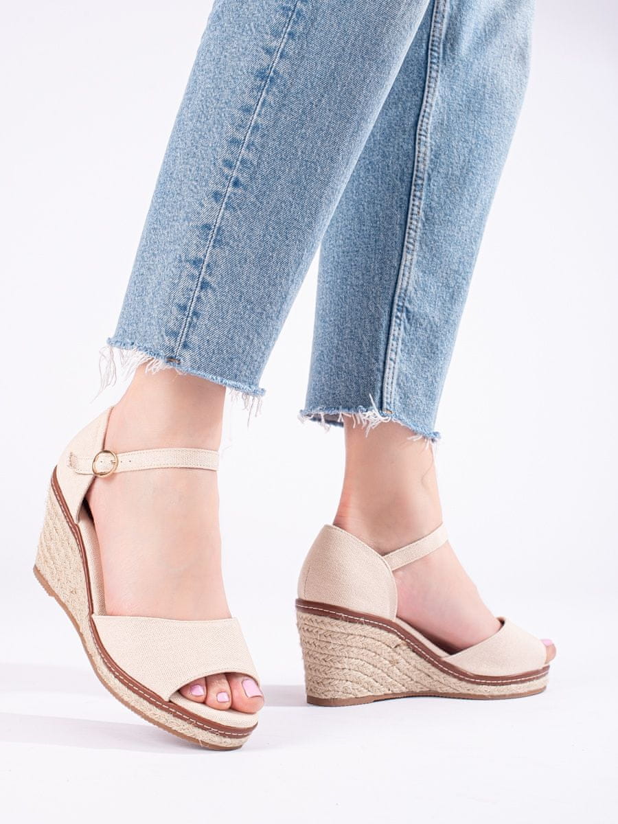 Barva odtenki rjave in bež, Platforma 2cm, Višina pete 5cm – 8cm, Peta 8cm, Stil eleganten, Vrsta pete klin, Stanje novo, Vrsta konice odprta, Noga odprto, Sezona pomlad/poletje, Vložek tekstylna, Material textilní, Podplat umetna masa, Priložnost za večer / žur, Vrsta zapiranja zaponka. Celoten opis