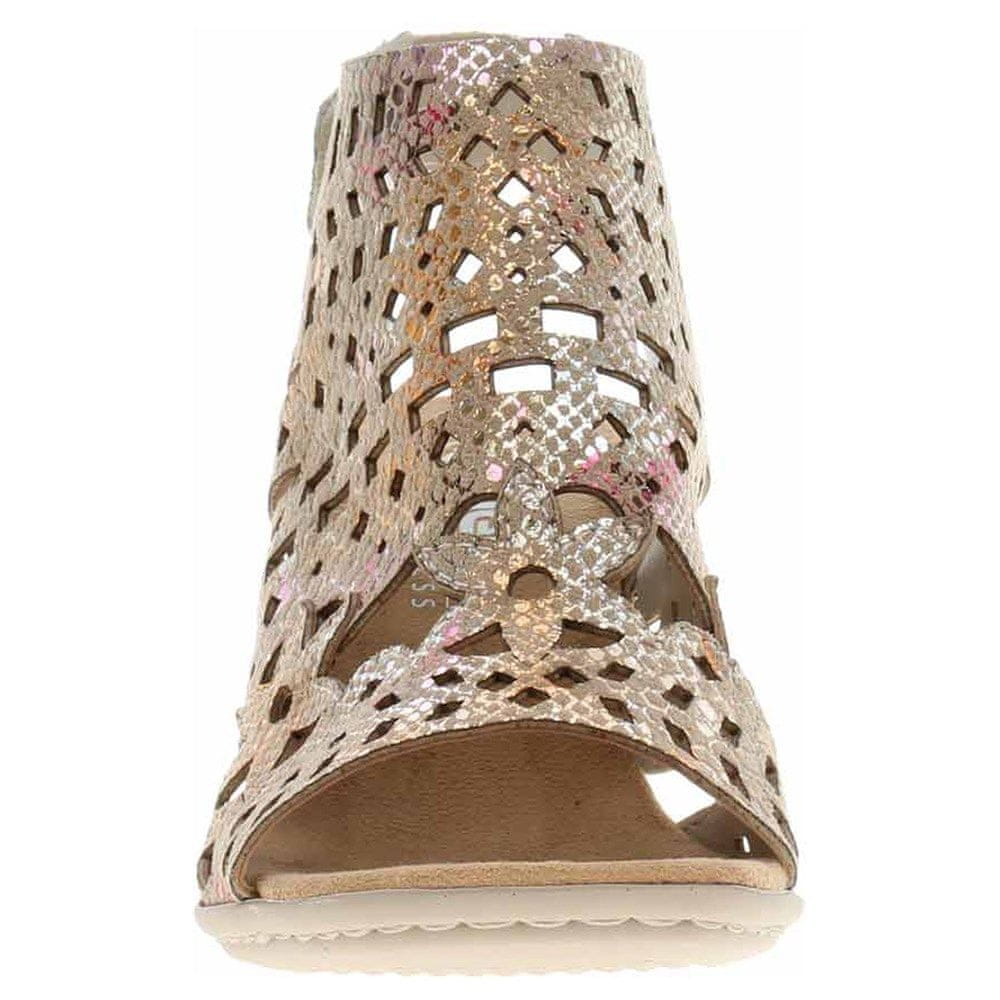Predstavljamo ženske sandale priznane blagovne znamke Rieker. Zgornji del je izdelan iz večbarvnega, visokokakovostnega materiala. Vložek je izdelan iz prijetne tkanine na dotik, podložene z mehko peno, ki zagotavlja občutek udobja. Notranjost je prav tako podložena z mehko tkanino. Celoten opis