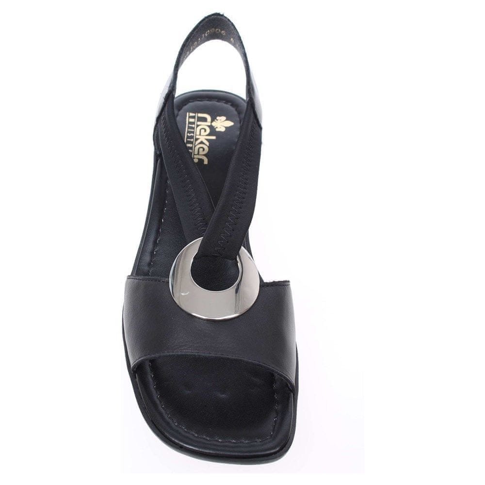Sandali priznane blagovne znamke Rieker. Črn zgornji del je izdelan iz pravega usnja, kombiniranega z visokokakovostno plastiko in elastiko. Okrogla kovinska aplikacija v srebrni barvi služi kot dekorativni element in povezuje sprednji del zgornjega dela z zadnjim. Celoten opis