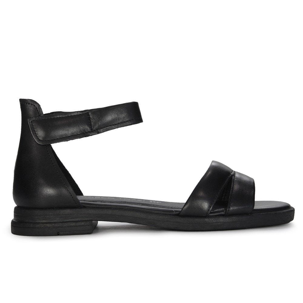 Lahki ženski ravni sandali so najnovejši model znamke Marco Tozzi. Sandali so izdelani iz črnega pravega usnja. Nastavljiv trak z ježkom bo sandale prilagodil širini vašega stopala. Podloga je iz mehkega materiala, vložek pa iz usnja. Peta je visoka 3 cm. Poletna klasika.