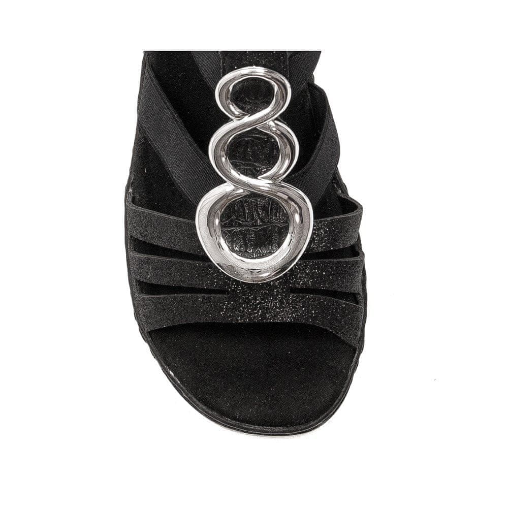 Blagovna znamka RIEKER ponuja nekaj za vsakogar, ne glede na starost ali preference. V naši spletni trgovini MIDIAMO predstavljamo čudovite in zelo udobne sandale. Ta model je odlična možnost za tiste, ki cenijo udobje, priročnost in stil. Sandali Rieker so v celoti izdelani iz visokokakovostnega materiala. Črn zgornji del je sestavljen iz kombinacije svetlečih plastičnih trakov in prožne gume, ki stabilizira čevelj na nogi. Sredina zgornjega dela je okrašena s srebrnimi elementi, ki pritegnejo pozornost in čevljem dodajo eleganco. Nedrseč podplat je črna platforma z višino 4,5 cm pod peto in 2 cm pod prsti. Ta model lepo zoži nogo in zagotavlja občutek stabilnosti. Celoten dizajn je izdelan z veliko pozornostjo do detajlov. Lahki in zelo udobni za ženske vseh starosti in z mnogimi stili.