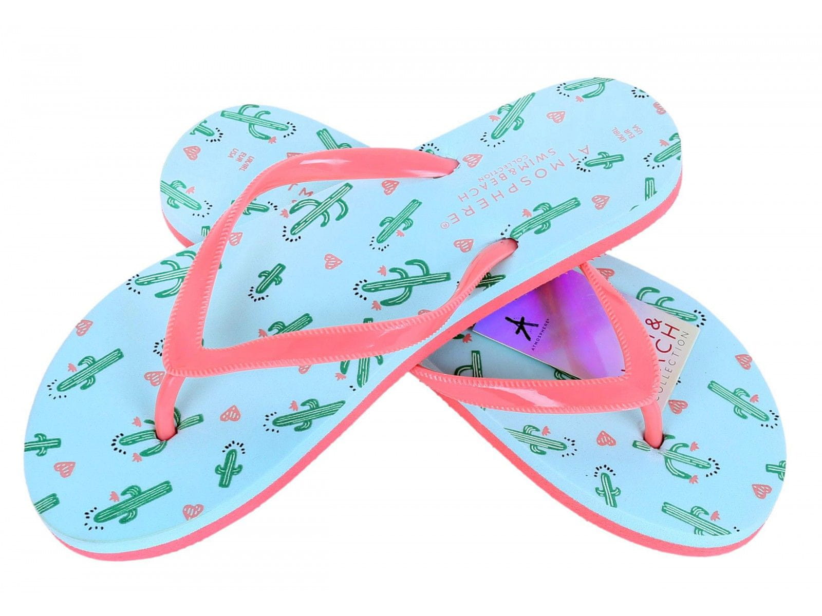 Japonke so izdelane iz debele, trpežne pene,z mehkimi silikonskimi trakovi.Metine barve z vzorcem kaktusov, roza trakovi.Podplat ima izreze, ki v pesku puščajo napis „VACAY VIBES“. Velikost: 36 – 37 Dolžina: 24,5 cm Celoten opis