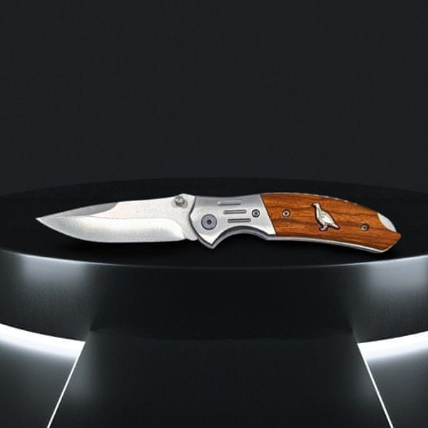 Dolžina rezila: 85 mm Celotna dolžina: 197 mm Debelina rezila: 2,8 mm Teža: 146 g Oblika rezila: Klasična Material rezila: 3Cr13Mov Material ročaja: Les Varovalo: Da na zadnji strani Celoten opis