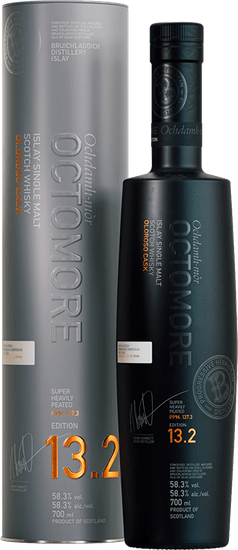 Bruichladdich Octomore Edition: 13.2 nadaljuje serijo in je s petletnim skladiščenjem v First Fill Oloroso Sherry Butts tudi odlična alternativa 13.1. Skladiščenje sodov je 100% na otoku Islay. Za proizvodnjo se uporablja samo škotski ječmen Concerto. Celoten opis