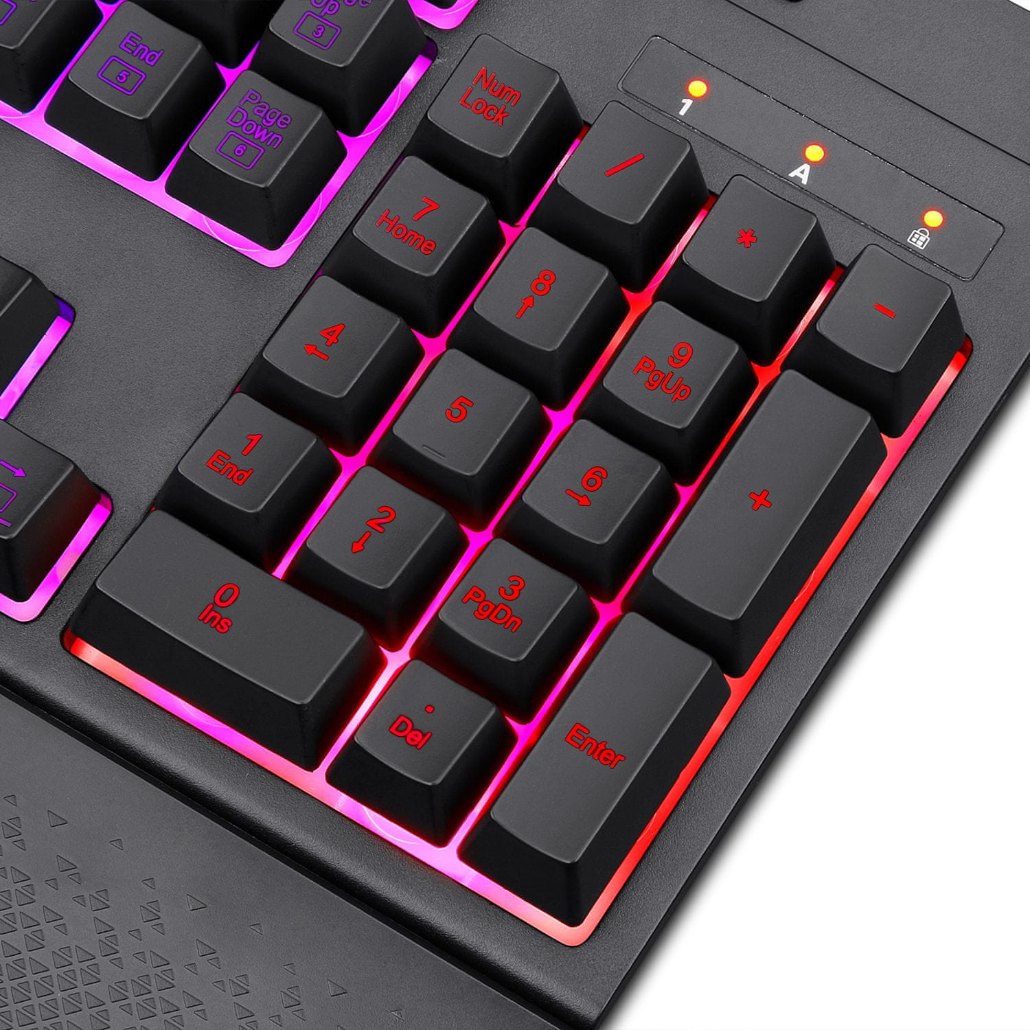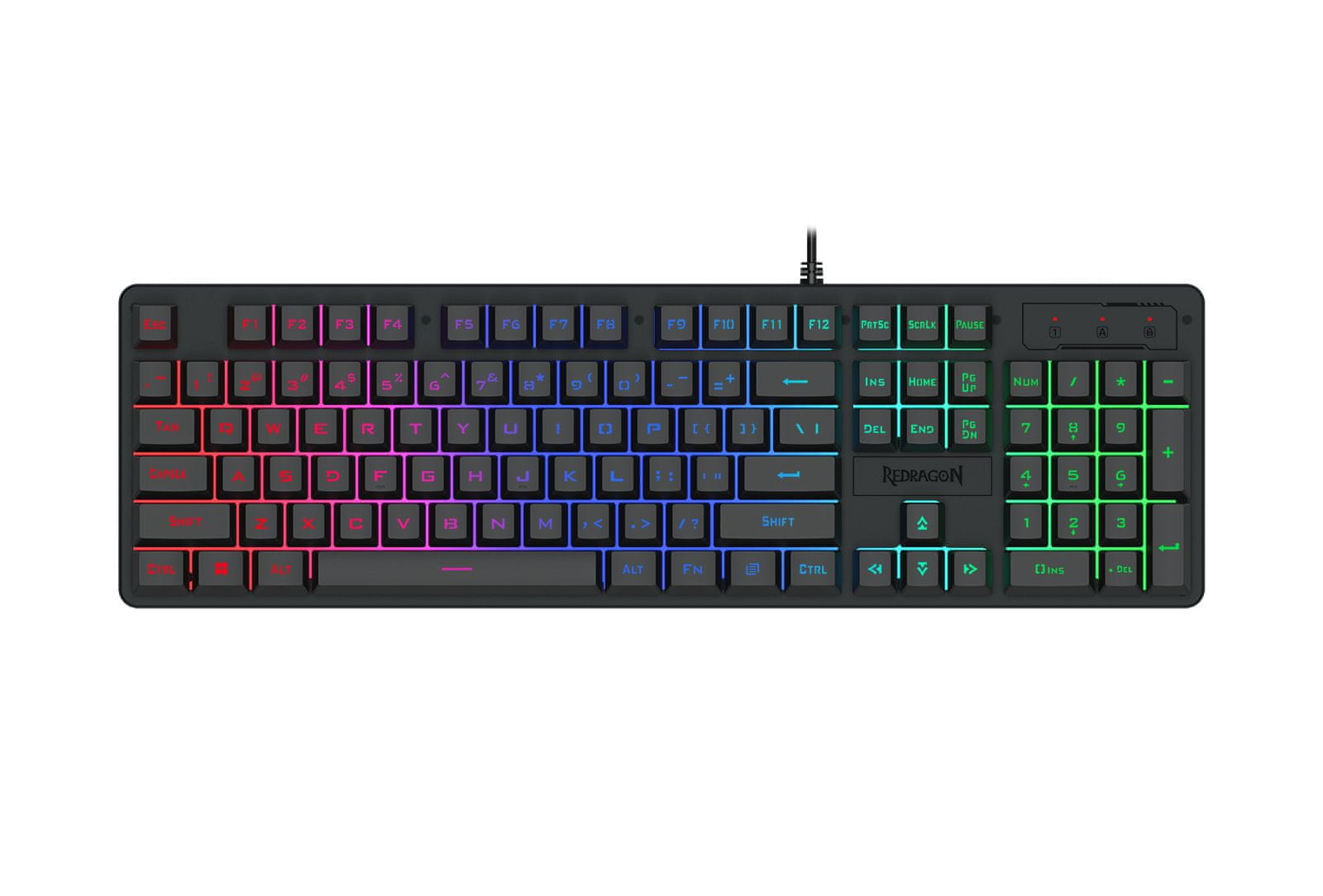 Redragon Netherbane K521 RGB je elegantna in zmogljiva membranska gaming tipkovnica, ki združuje udobje vsakodnevnega dela z odzivnostjo, ki jo zahteva sodobno igranje iger. Gre za tipkovnico polne velikosti (104 tipk), kar jo naredi idealno za tiste, ki poleg igranja potrebujejo tudi numerični del za produktivno delo.