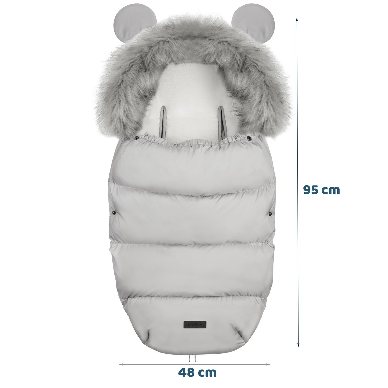 Mehko, občutljivo in odstranljivo krzno, Moderen in moden dizajn, Podložen z žametno mehko antialergijsko tkanino, Odpira se z dvema dvostranskima zadrgama (zgoraj in spodaj), Sprejemljivo za 2-, 3– in 5-točkovne pasove, Pritrdilni element preprečuje zdrs zaščitne noge v vozičku, Ščiti pred vetrom in snegom – kot nalašč za sankanje!