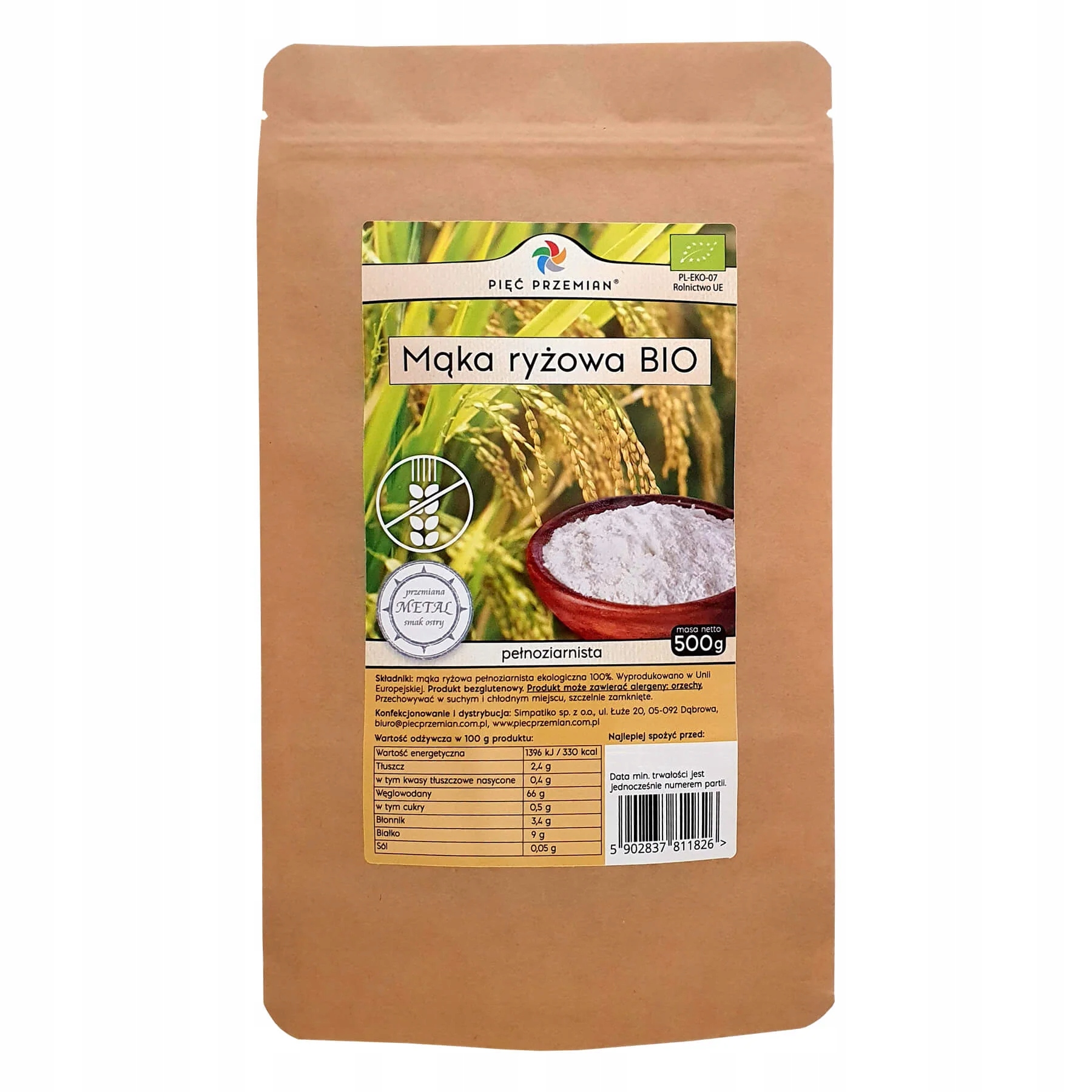 Organska polnozrnata riževa moka brez glutena 500 g – Piąty Przemiany