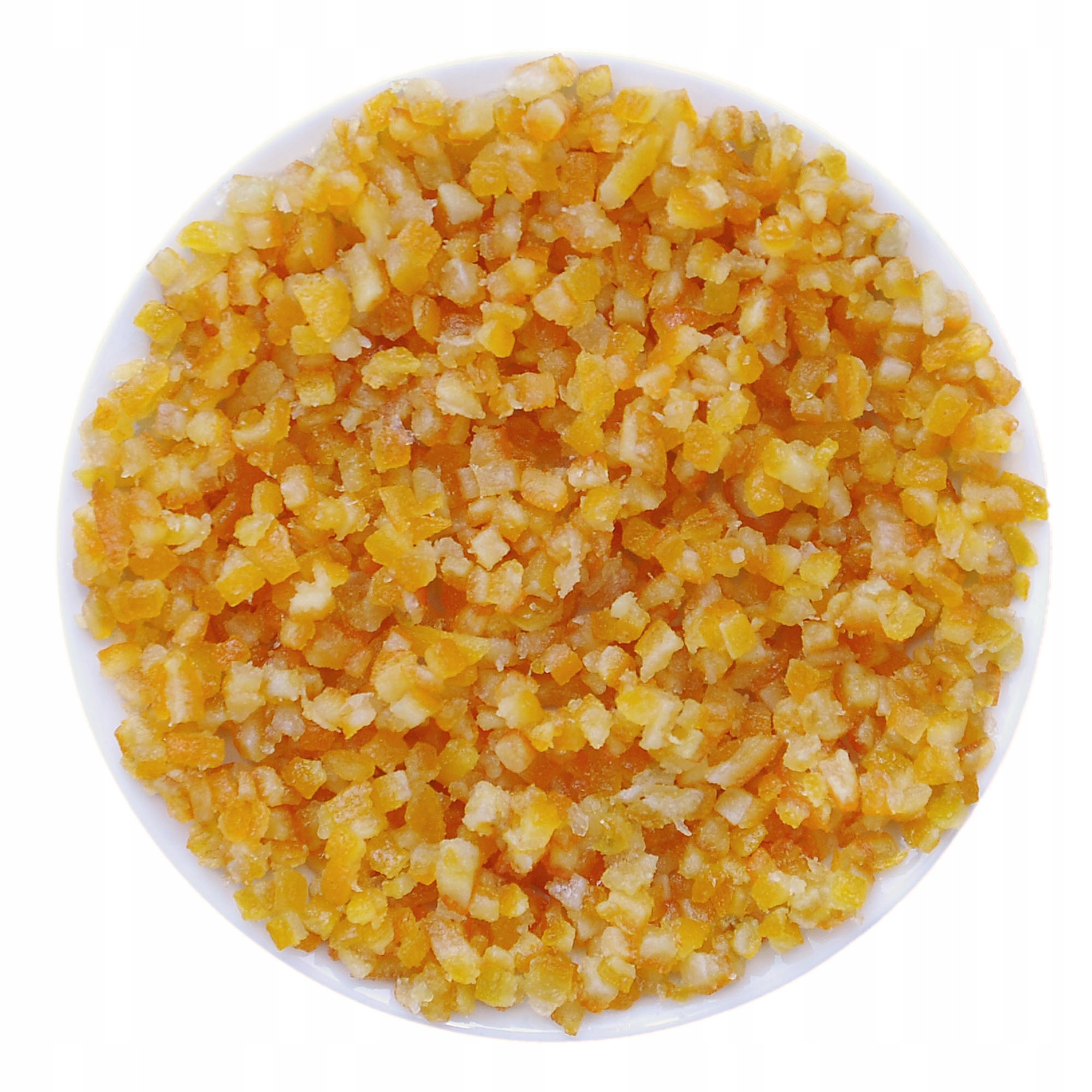 Pomarančna lupina v obliki kock velikosti 4×4 mm je odličen dodatek tortam in sladicam. Uporabite ga lahko za ustvarjanje dekoracij različnih oblik.