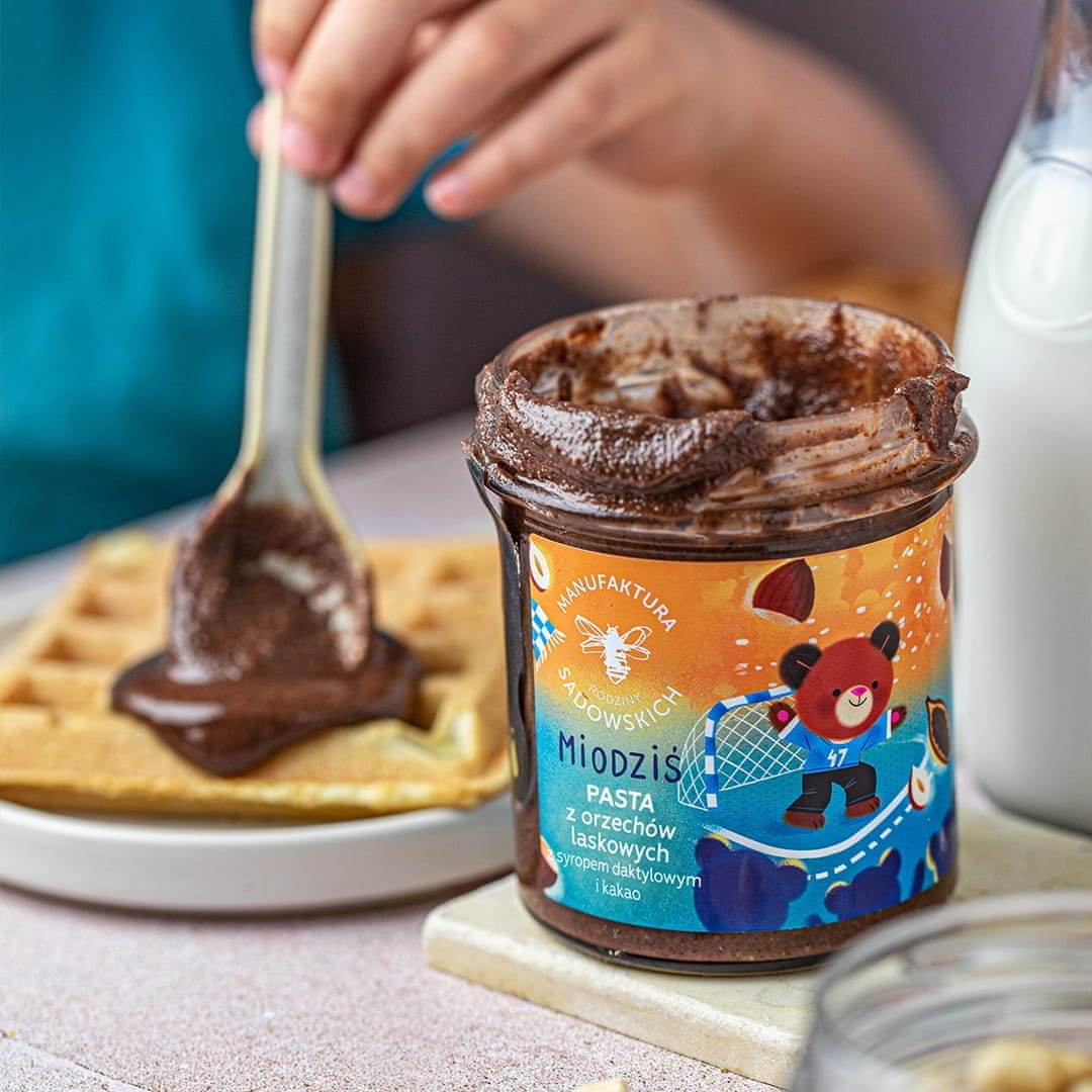 Miodziśev namaz, narejen iz skrbno izbranih lešnikov, je uspešnica! Naš medvedek pa je lešnikovemu maslu dodal malo kakava, ker je sanjal o okusnem, naravnem in rahlo čokoladnem prigrizku! Da bi preprečili, da bi vsebnost kakava naredila namaz grenak, smo okus okrepili z malo datljevega sirupa. Miodziś je dobro premešal, da je dosegel gladko konsistenco, in to je to! Naš sladkosned je zaploskal – kakšen čudovit okus! Psssst … Lešnikov namaz z datlji in kakavovim sirupom ne vsebuje drugih dodatkov, ojačevalcev ali konzervansov! Opazen okus oreščkov, kakava in prijeten kanček sladkobe v vsakogar vzbujata željo po tem dodatku – za zajtrke, sladice, prigrizke in celo sladke popoldanske malice!