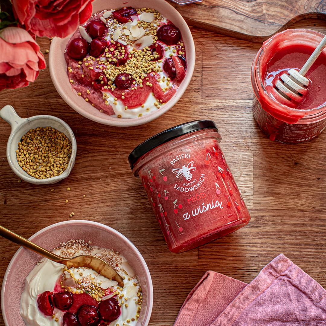 Kremni večcvetni med s 3 % liofilizirane češnje. Saden, globok okus in 100 % naraven!