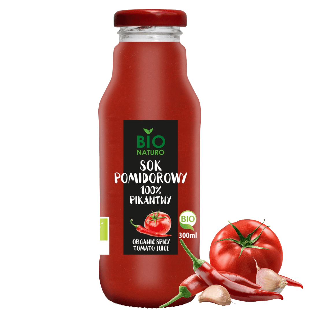 BioNaturo ekološki paradižnikov sok je odličen vir številnih vitaminov: C, A, E in mineralov, med katerimi je največ kalija, pa tudi broma, železa, magnezija, mangana in fosforja. Paradižnik vsebuje veliko pektina, likopena in veliko vlaknin. Zahvaljujoč temu ima njihovo pogosto uživanje: – protirakave učinke, – krepi imunski sistem, – lajša posledice preobremenitve z alkoholom, – vpliva na dobro počutje, – izboljšuje delovanje živčnega sistema. Organski paradižnikov sok z dodatkom čilija, tj. zdravega kapsaicina, je popolna kombinacija. Odlično bo dopolnil našo krepilno dieto. Sok je bil narejen iz ekoloških, certificiranih paradižnikov.