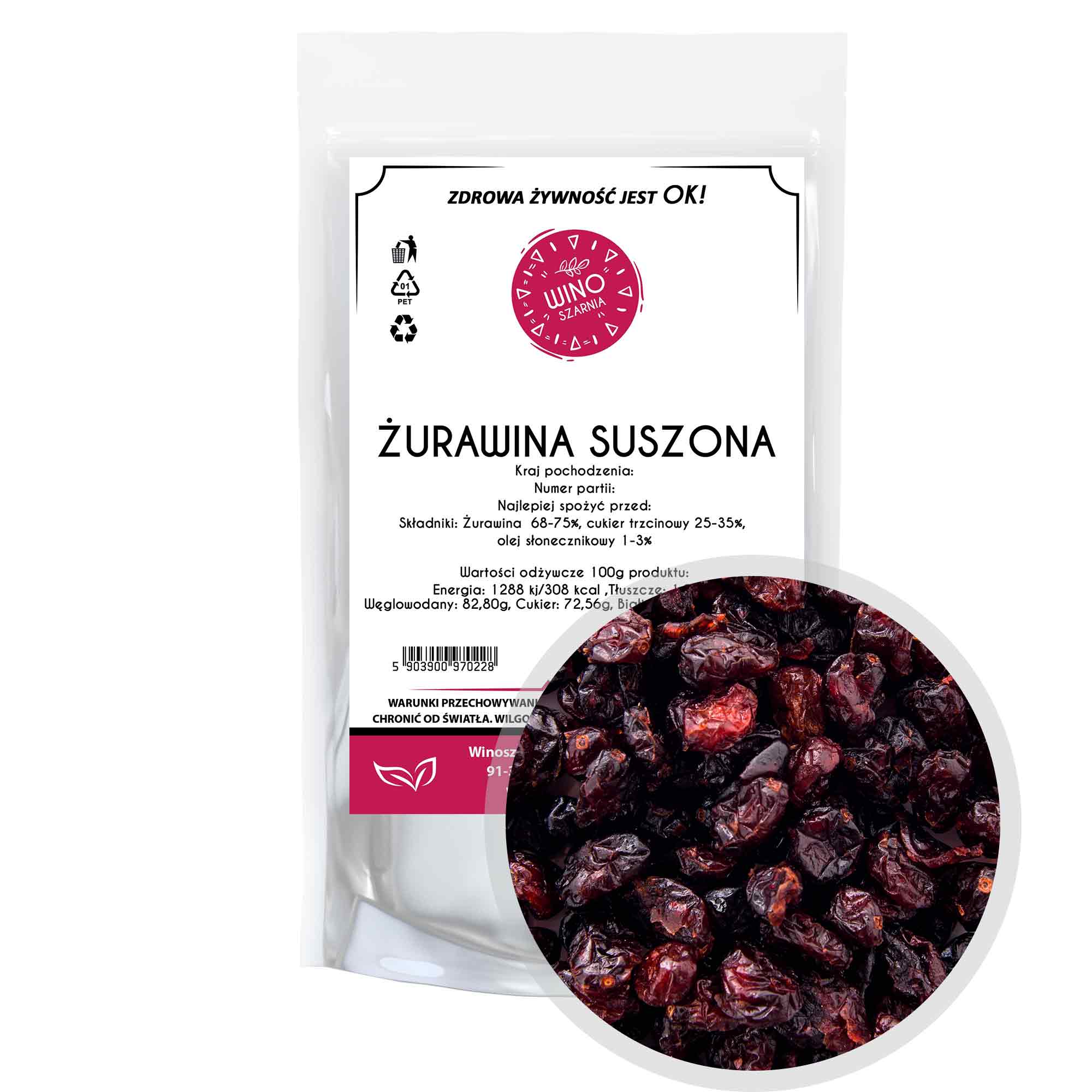 • Sestavine: brusnice 68–75%, trsni sladkor 25–35 %, sončnično olje 1–3 %