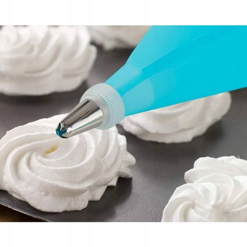 SLIŠČARSKI NALOG x2 SILIKONSKI OKRAŠEVALEC ZA TORTE 27 KOSOV Velik set slaščic! S slaščičarsko vrečko, lopatkami in glavniki za okraševanje tort in tartov Set za okraševanje tort, kolačkov, tartov in sladic. Set za amaterje in profesionalne slaščičarje! Dve veliki, močni in trpežni slaščičarski vrečki z zamenljivimi konicami ter lopatkami in glavniki olajšata doseganje profesionalnih rezultatov. Komplet 24 konic in dveh tulcev, 3 lopatic in čistilne palice vam bo omogočil pričaranje najrazličnejših vzorcev. Sestava celotnega kompleta je izredno enostavna, prav tako razstavljanje in čiščenje. Silikonski tulec in lopatice za večkratno uporabo lahko preprosto sperete pod vodo z detergentom – jeklene konice so primerne za pomivanje v pomivalnem stroju! Prednosti izdelka: primeren za okrasitev tort, mafinov, peciva in sladic ter mnogih drugih nepogrešljiv v vsaki kuhinji enostavna sestava in uporaba enostavno čiščenje – primerno za pomivalni stroj šifra izdelka: 1021 C-12 (novo C-142) Set vsebuje: 2 kos. silikonska slaščičarska vrečka 2 kos. plastična držala 24 kos. zamenljive okrasne konice 3 kos. lopatice 1 kos. čistilna palica 2 kos. sponke za tulec Priprava tulca za delo: Pripravimo škarje, slaščičarsko vrečko, držalo in izbrano konico. Pred prvo uporabo odrežite konec tulca, da plastično držalo zdrsne ven skozi luknjo. Pazite, da ne izrežete prevelike luknje, saj lahko držalo pod pritiskom izpade. Nosilec razdelite na dva dela. Notranji del držala vstavite v tulec in ožji konec potisnite ven skozi izrezano luknjo. Držala ne pritiskajte premočno. Na držalo položite izbrano okrasno konico. Z obročkom pritrdite konico na držalo. Tako pripravljen tulec napolnimo z izbrano maso.
