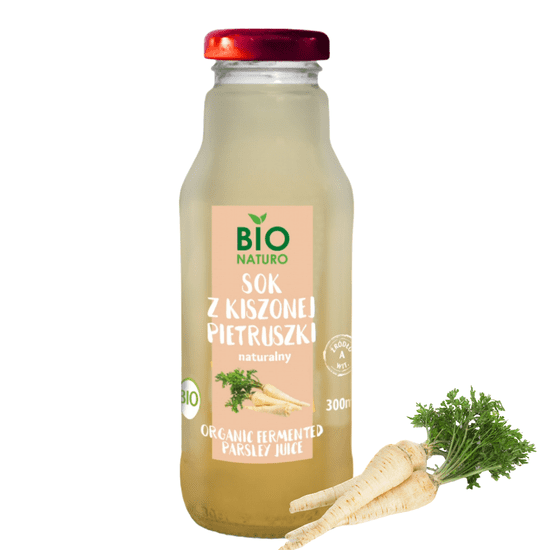 Sok, neposredno stisnjen iz ekološkega vloženega peteršilja, ekološkega česna, soli. Peteršilj vsebuje folno kislino/vitamin B9 in manjše količine drugih vitaminov skupine B (B3, B1, B2, B6, B5) in vitamina E ter mineralov: železo, kalij, kalcij, magnezij, mangan, cink, baker in fosfor. Vloženi peteršiljev sok vsebuje flavonoide (apigenin, kvercetin, kempferol), ki so izjemno dragoceni za naše zdravje. Priporoča se pri težavah z ledvicami z urolitiazo in oligurijo ter podpira razstrupljanje telesa in prebavne motnje. Ima čistilni in krepilni učinek; povečuje izločanje urina, razkužuje sečila, pomaga pri vnetju ledvic in mehurja ter pri urolitiazi; ima diaforetični, antipiretični in analgetični učinek; ima učinke proti aknam, razkužuje, zmanjšuje seborejo, posvetli, celi vnetja kože; zmanjšuje otekanje sklepov; uravnava delovanje želodca s spodbujanjem izločanja prebavnih sokov in ima antispazmodične učinke na gladke mišice, odpravlja napenjanje; pozitivno vpliva na prekrvavitev genitalij.