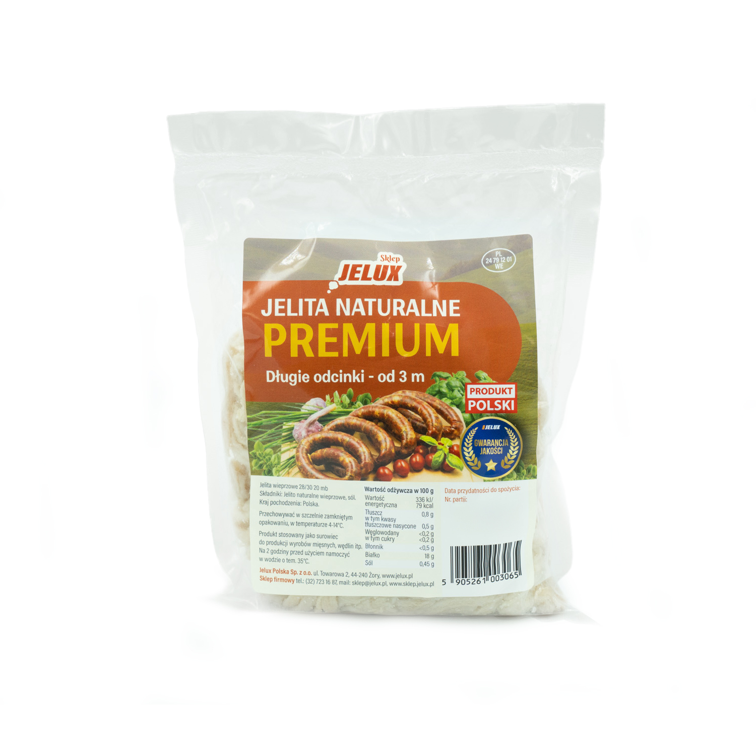 Proizvedeno na Poljskem iz domačega klanja. Ta čreva so zelo elastična, odporna proti pokanju, izbrana za zagotavljanje najvišje kakovosti, minimalna dolžina enega dela čreva pa presega 3 m .