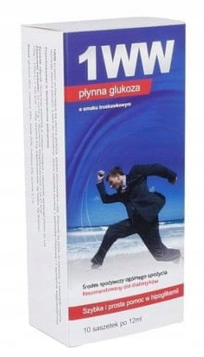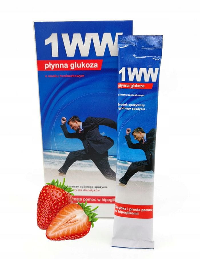Tekoča glukoza 1WW z okusom jagode, 10 vrečk po 12 ml. Tekoča glukoza 1WW je glukoza, ki se hitro absorbira. Vsakdo, ki mu grozi hipoglikemija, jo lahko zlahka uporabi med nenadnim padcem ravni glukoze v krvi. V mnogih primerih lahko celo reši bolnikovo življenje. Ko se pojavi hipoglikemija – padec glukoze v krvi – morate čim prej zaužiti 10–20 g hitrodelujočih ogljikovih hidratov (z visokim glikemičnim indeksom). NAVODILA ZA UPORABO: Ko raven glukoze v krvi pade, morate čim prej zaužiti 10–20 g hitrodelujočih ogljikovih hidratov (z visokim glikemičnim indeksom). Najbolje je, da zaužijete 1–2 vrečki tekoče glukoze 1WW. Po 15 minutah izmerite raven sladkorja v krvi in po potrebi vzemite še 1–2 vrečki tekoče glukoze 1 WW. SESTAVINE: Glukoza – 38 %, Maltoza – 33 %, Voda – 18,9 %, Fruktoza – 9 %, Magnezij (magnezijev klorid) – 1 %, Aroma približno – 0,1 %