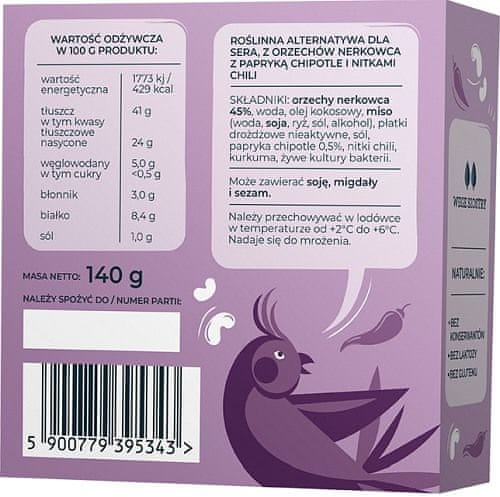 Sestavine: oreščki indijski oreščki 45 %*, izvirska voda, kokosovo olje, miso ( soja ), prehranski kvas, himalajska sol, čipotlov poper, čili nitke, kurkuma, žive bakterijske kulture.