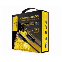 Cablexpert hibridni optični HDMI AOC kabel dolžine 10m uporablja tehnologijo optičnih vlaken in zmanjšuje tveganje EMI/RFI v okoljih z visokimi motnjami. Vzdržljiv tanek pleten kabel vrhunske kakovosti z elegantnimi kovinskimi priključki, podpira ločljivosti 4K pri 60Hz.