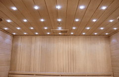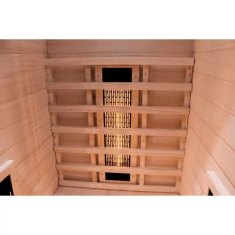 Kompaktna savna iz kanadskega hemlock lesa združuje naravno toplino in moderno tehnologijo infrardečih grelcev polnega spektra. Zagotavlja globoko sprostitev, razstrupljanje in izboljšano počutje – vse v udobju vašega doma. Elegantna LED osvetlitev ustvari popolno wellness vzdušje vsak dan.