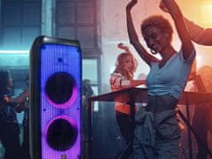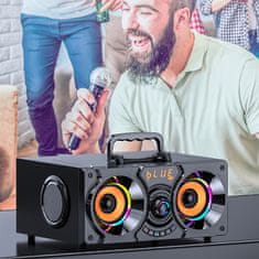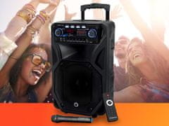 Prepustite se glasbi in izberite prenosni KARAOKE zvočnik Manta SPK330B OTUS! Zvočnik navdušuje z napredno Bluetooth 5.3 povezavo za povezovanje z napravami, vgrajena pa ima tudi vhode USB, AUX in MIC, ki še dodatno pripomorejo k njegovi funkcionalnosti. Odlikuje ga vgrajena polnilna baterija, ki mu omogoča delovanje brez kablov, njegova lahka teža in vgrajen ročaj za nošenje pa sta kot nalašč za enostavno prenašanje. Atraktivna RGB LED osvetlitev poskrbi za stilski in moderen videz, zvočnik pa se lahko pohvali tudi z TWS funkcijo povezovanja in predvajanja na dveh enakih zvočnikih hkrati!