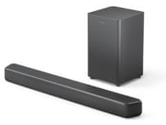 22.1-kanalna zvočna vrstica Philips TAB6309/10 z brezžičnim nizkotoncem. Skupna izhodna moč 160 W (RMS) (maks. 320 W). Zvok Dolby Digital/Dolby Digital Plus/DTS Digital Surround/DTS Virtual:X. Združljivost z Bluetooth LE Audio, upravljanje prek aplikacije aplikacije Philips Home Entertainment. Vmesnik: 1 × HDMI (eARC/ARC), digitalni optični vhod (zvok), 1× USB, 1× 3,5-milimetrski zvočni vhod.