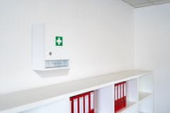 Stenska kovinska omarica za prvo pomoč za 10 oseb je zasnovana tako, da zagotovi medicinski material kar za 10 oseb, ki potrebujejo oskrbo. Omarica za prvo pomoč je izdelana iz kovine, dimenzije omarice so 30 cm x 30 cm x 15 cm.