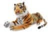 Plišasti rjavi tiger velikosti približno 55 × 28 × 18 cm (brez repa), dolžina repa približno 37 cm.