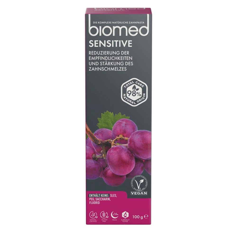 Zobna pasta Biomed Sensitive je bila klinično preizkušena in potrjeno ima pomirjujoč učinek na dlesni . Ne vsebuje fluorida in je varna za sklenino. Izdelek shranjujte pri od 0 °C do +25 °C