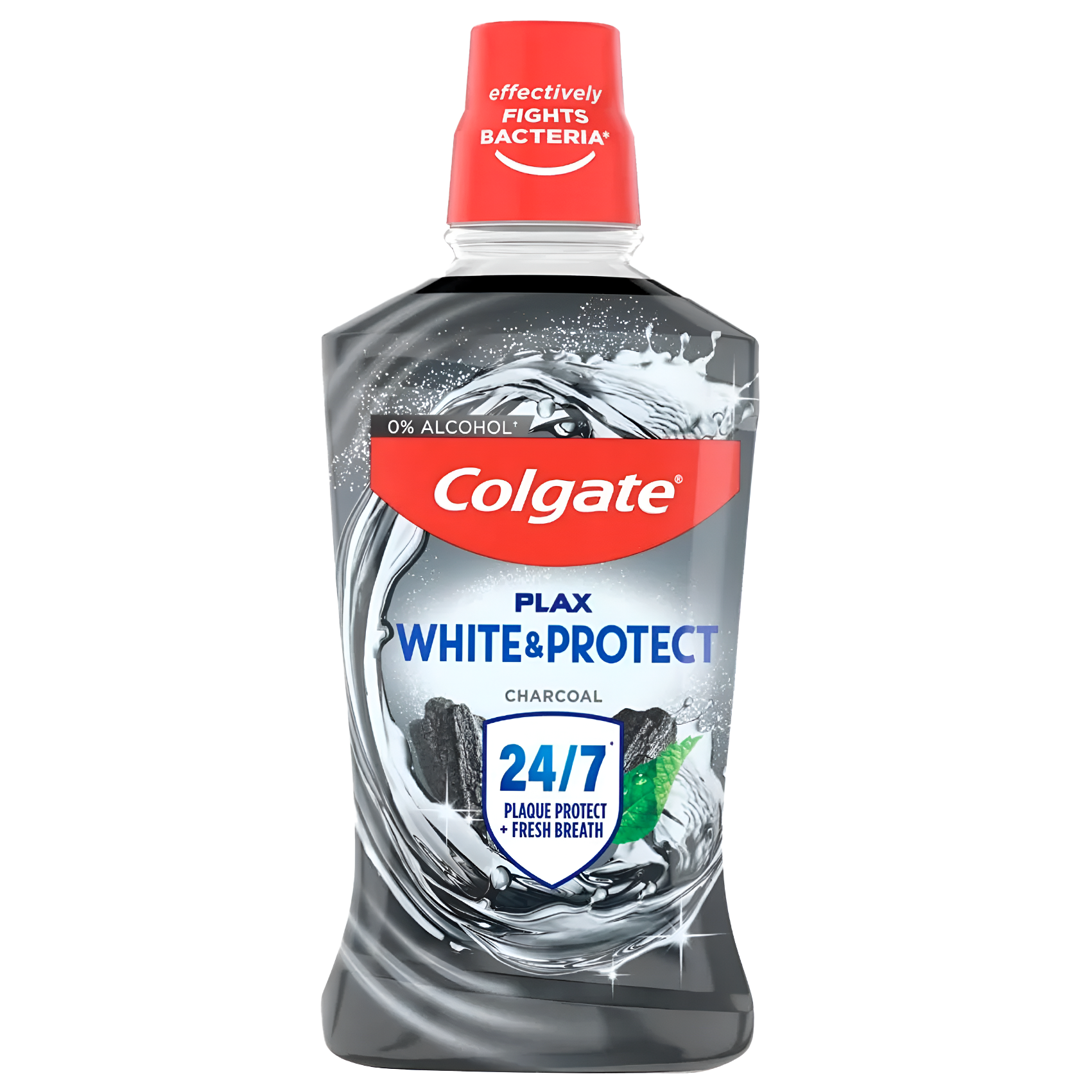 Ustna vodica Colgate Plax z aktivnim ogljem s tehnologijo White Protect in izvlečkom aktivnega oglja. Preprečuje nastajanje madežev in pomaga ohranjati zobe dlje časa bele. Klinično dokazano se formula bori proti bakterijam in zagotavlja 24-urno zaščito pred zobnimi oblogami, če jo uporabljate dvakrat na dan. Ima nežen metin okus brez pekočega občutka.