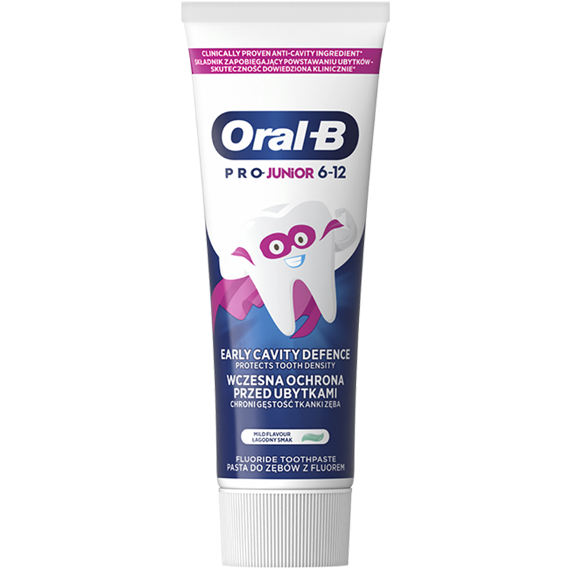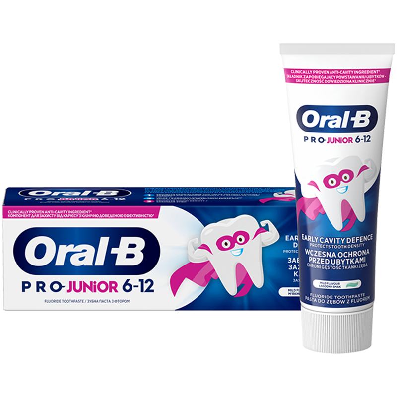 Zobna pasta Oral-B Pro Junior je bila ustvarjena za otroke, stare od 6 do 12 let. Razvita v sodelovanju z zobozdravniki, učinkovito ščiti zobe pred poškodbami, krepi sklenino in preprečuje karies. Zaradi vsebnosti kositrovega fluorida zobna pasta ne le ščiti pred kariesom, temveč ima tudi antibakterijske lastnosti, ki spodbujajo zdravje ustne votline. Blag okus mete spremeni vsakodnevno ščetkanje v užitek.