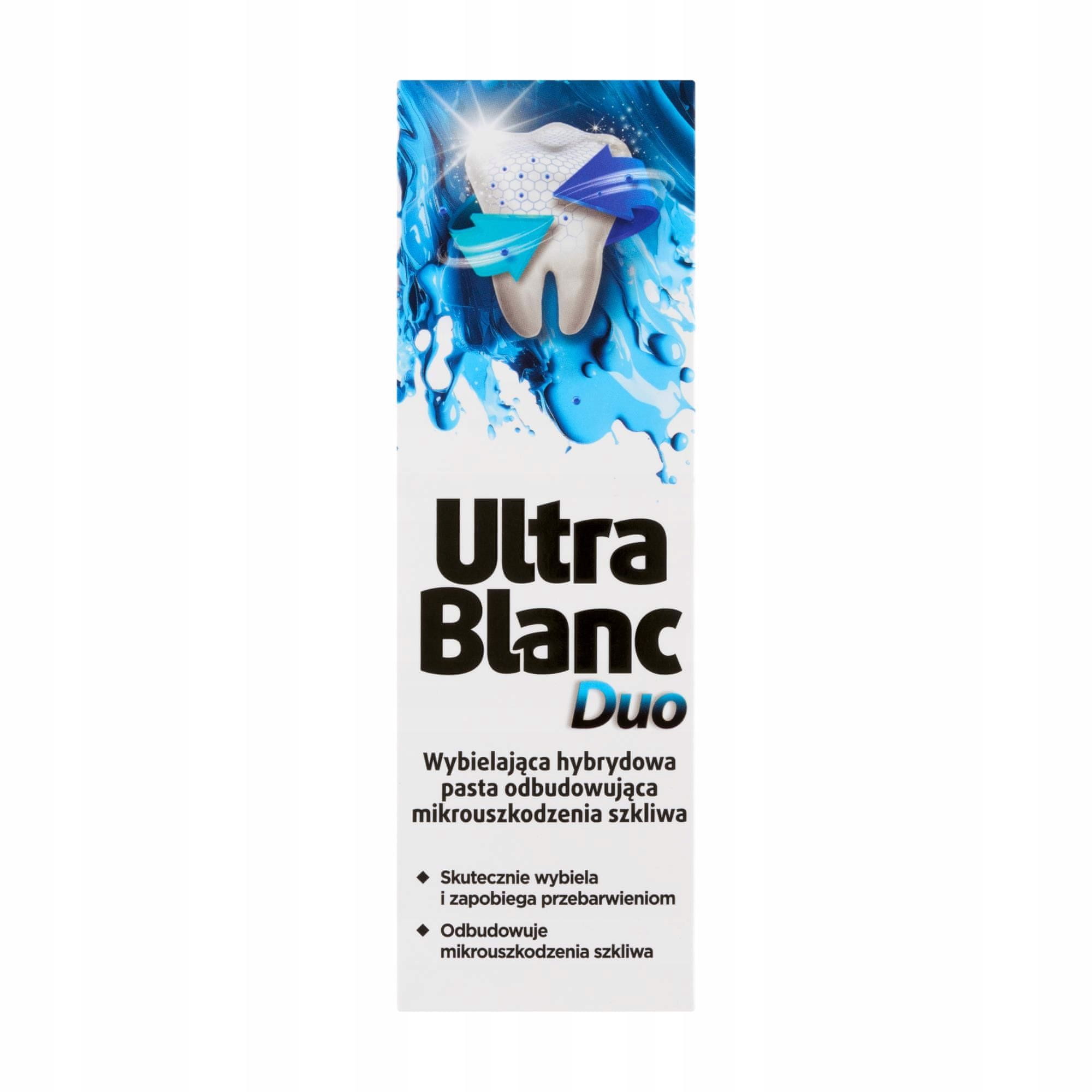 Zobna pasta UltraBlanc Duo 75 ml UltraBlanc Duo je hibridna zobna pasta, ki učinkovito beli in popravlja mikropoškodbe v sklenini ter obnavlja njeno celovitost. Hidroksiapatit je naravna sestavina sklenine in dentina. Remineralizira sklenino tako, da jo globoko prodre in obnovi njeno celovitost. Prav tako popravlja že nastale mikropoškodbe na površini zoba in zmanjšuje občutljivost. Deluje sinergistično s fluoridom in podpira zaščito pred kariesom. Navodila: Zobe si umivajte 2–3 krat na dan po 2–3 minute. Ne pogoltnite. Ta zobna pasta je primerna za odrasle in otroke, starejše od 12 let.