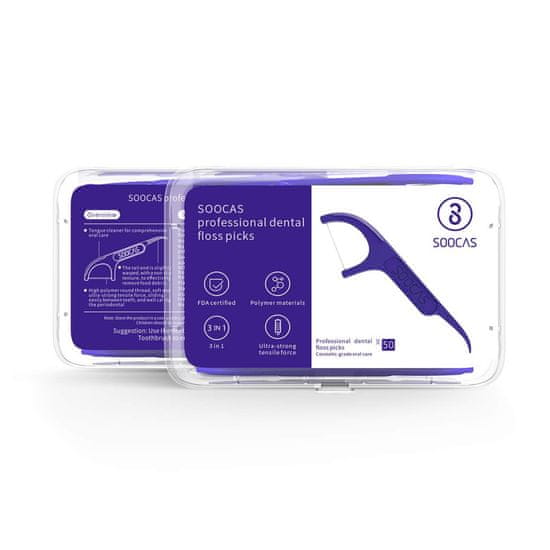 Set Soocas vsebuje 50 zobnih nitk z držalom. Celoten opis