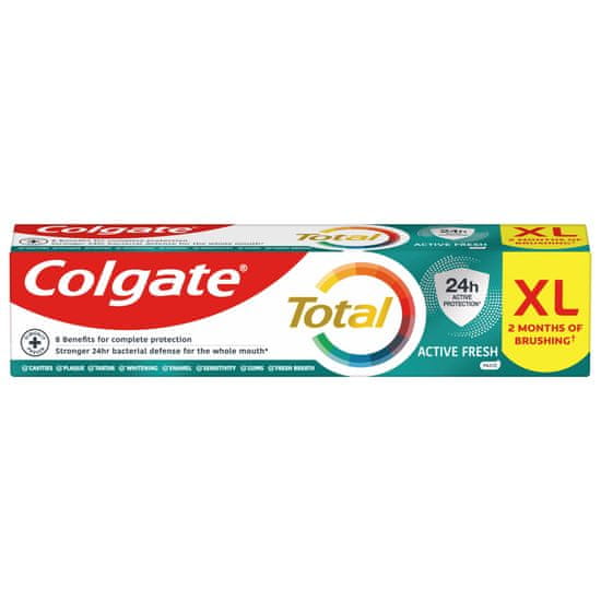 Colgate Total Active Fresh XXL zobna pasta pomaga v boju proti bakterijam v ustih **za 12 ur, ki so glavni vzrok slabega zadaha, ne le na zobeh, temveč tudi na jeziku, dlesnih in licih. Za dolgotrajen svež zadah in bolj zdravo ustno votlino. Celoten opis